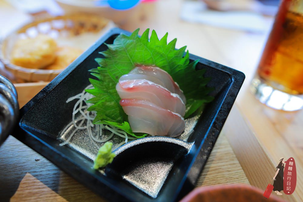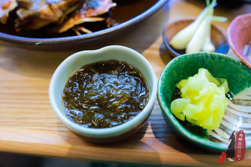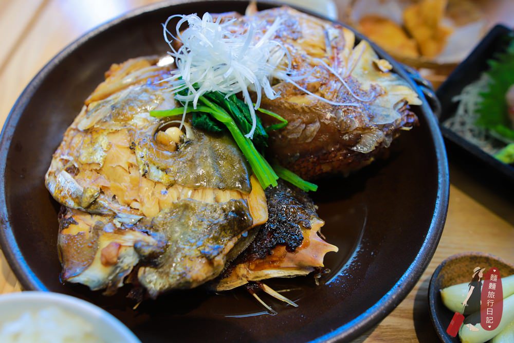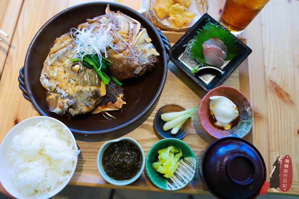 我點了一份海人定食,送上來被這兩顆超大魚頭嚇到,哈哈哈~套餐小菜很豐盛捏,除了主菜魚頭外、基本的白飯跟味噌湯,還附上了3種小菜跟一份生魚片跟炸魚,以及甜點,會飽炸