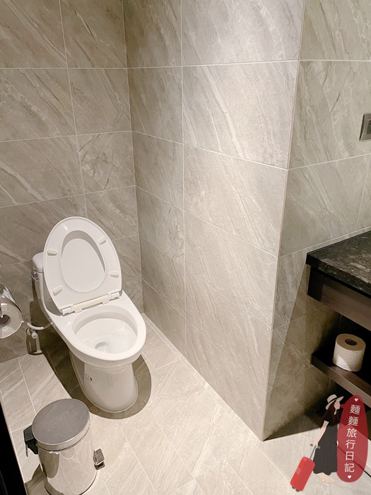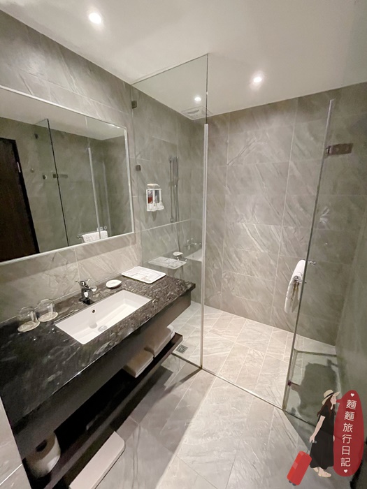衛浴空間很一般~單人洗手台,簡單的備品放在桌上,左邊是馬桶、右邊是乾濕分離的淋浴間,沐浴乳洗髮精直接掛在牆上共用按壓的那種,我個人不愛共用設計,所以都會自備洗澡備品。