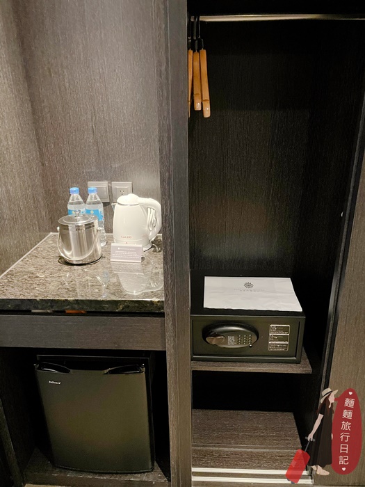 簡單小巧的衣櫃,衣櫃裡有小台保險箱;旁邊的茶水櫃,台面上放了兩瓶礦泉水,跟熱水壺!中間抽屜打開有馬克杯跟茶包等,下方則是一台小冰箱。