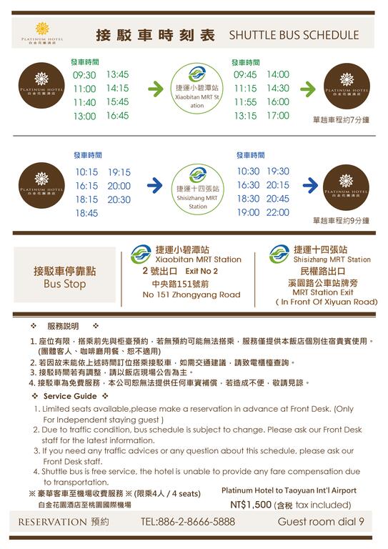 搭乘大眾運輸工具也不用擔心,可以搭捷運到 捷運新店站 或 捷運小碧潭站,酒店有免費定時定點往返酒店跟捷運站的接駁車服務喔!接駁車僅供住客搭乘,想要搭乘的住客要記得跟櫃台預約!