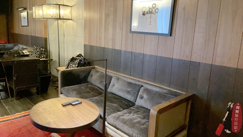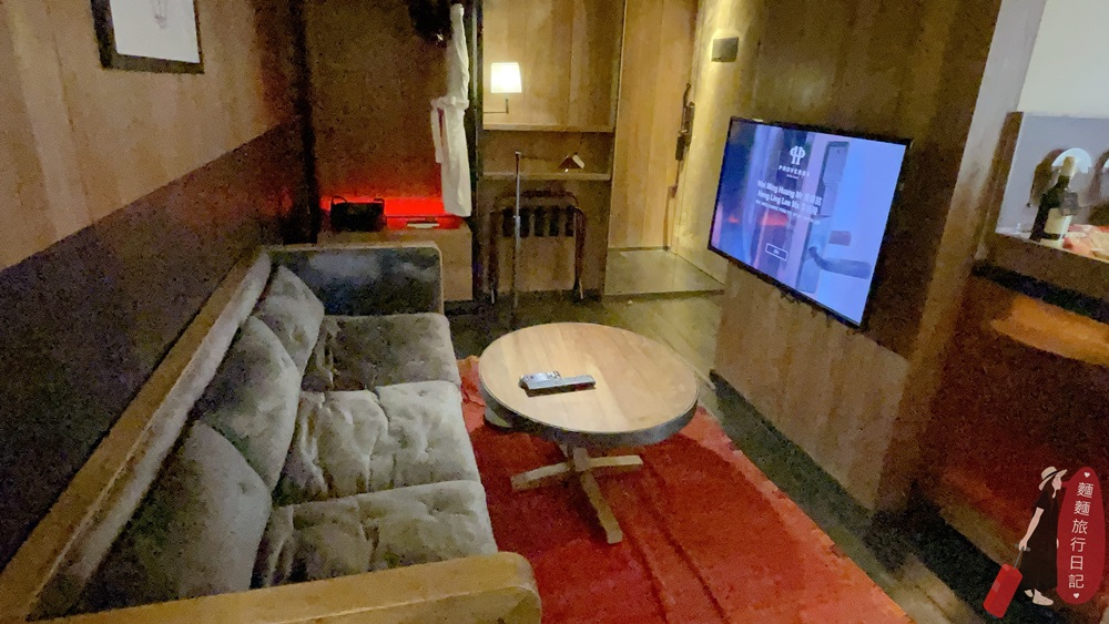 沙發前還有一個圓形的桌子&檯燈,前面牆壁就是吊掛電視,雖然客房空間坪數只有9坪,但以台北的客房來說已經滿OK了!只是走過去要小心不要撞到電視XD,電視裡滿多電影選擇可以看,還不錯。