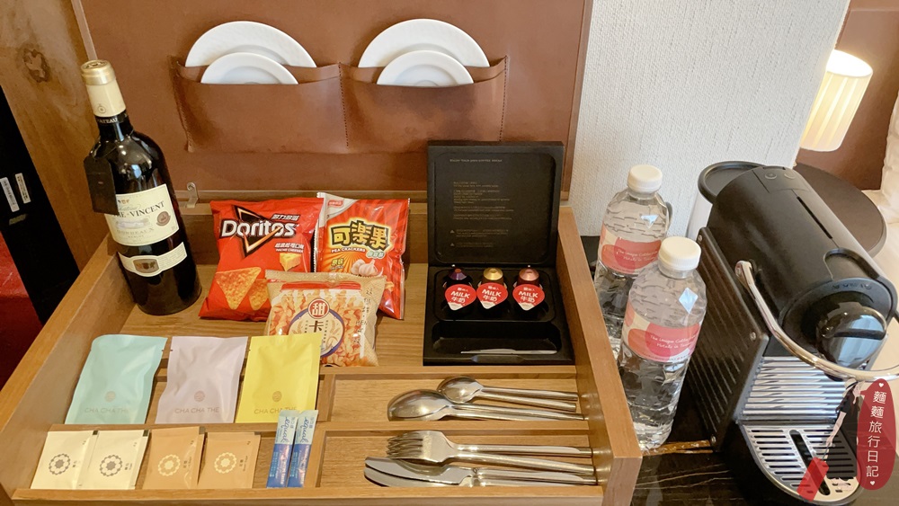 Mini Bar提供滿多餅乾,除了一般的茶包還有一瓶紅酒,但红酒是要付錢的哦,另外還有提供膠囊咖啡機。
