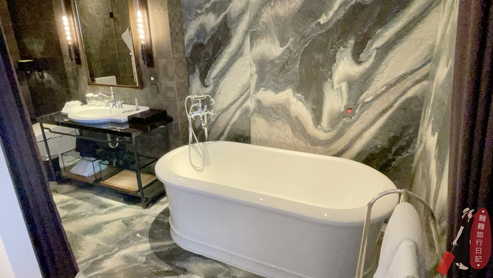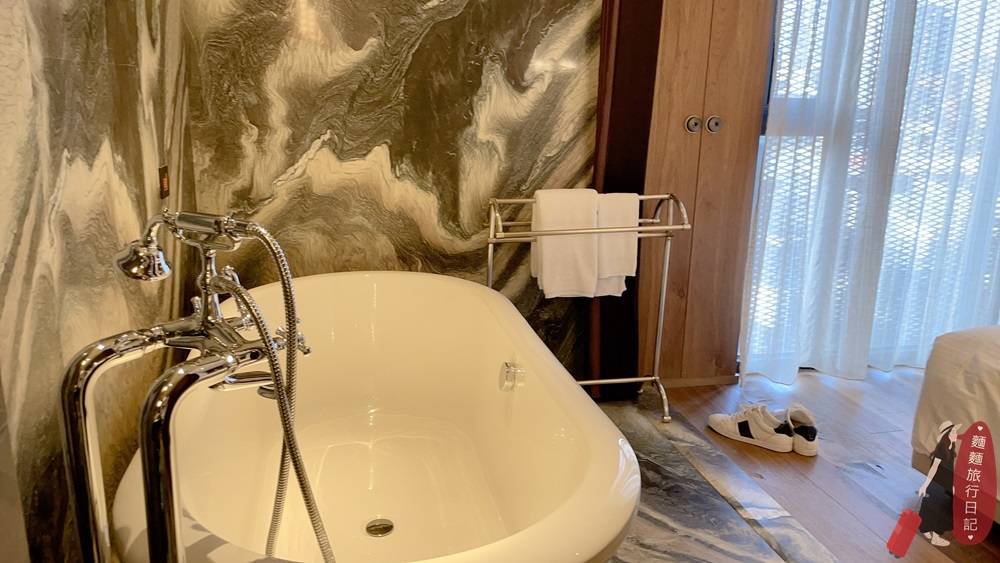 超大浴缸搭滿舒服的,就連浴缸水龍頭也很復古,旁邊有浴袍浴巾架,害羞的話浴室跟臥床區有簾子可以拉上隔開!