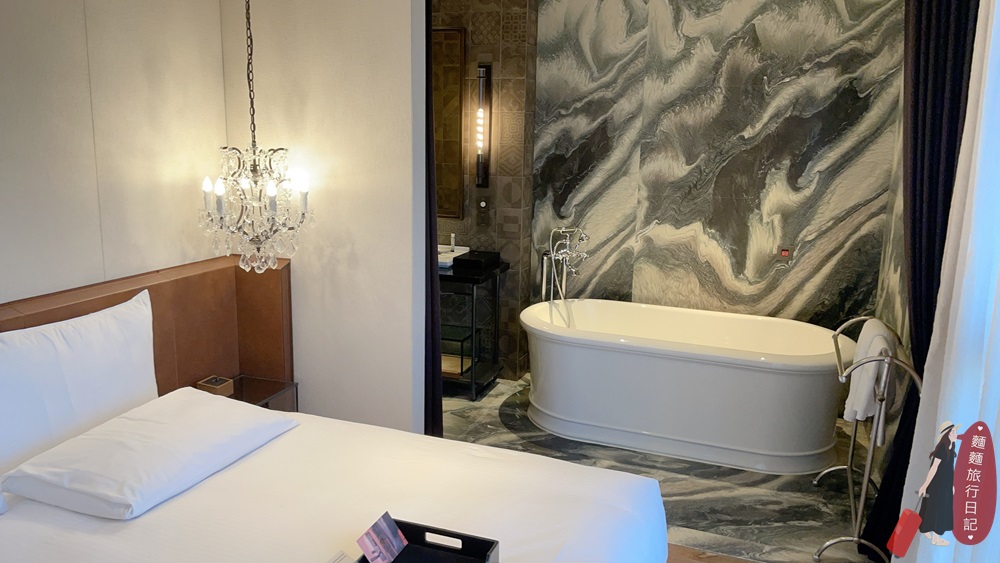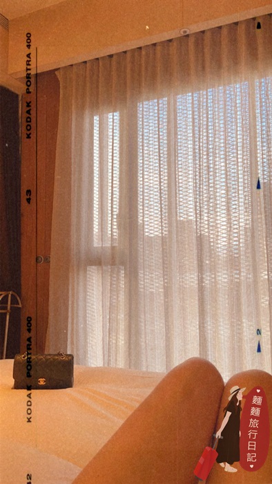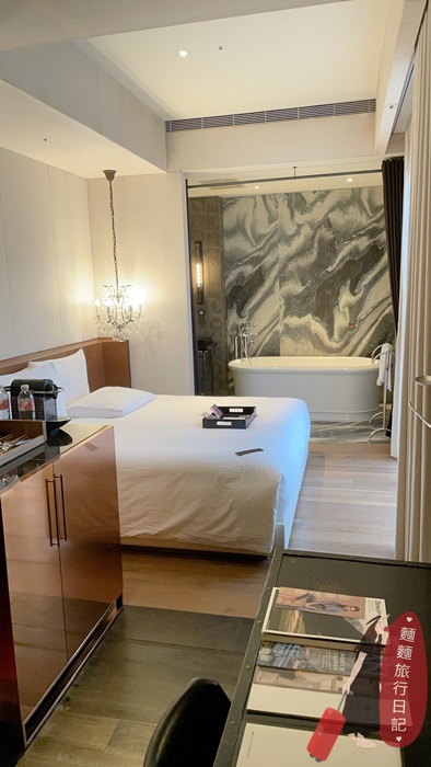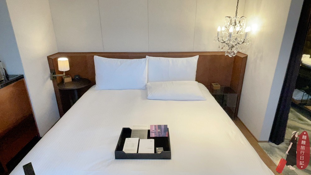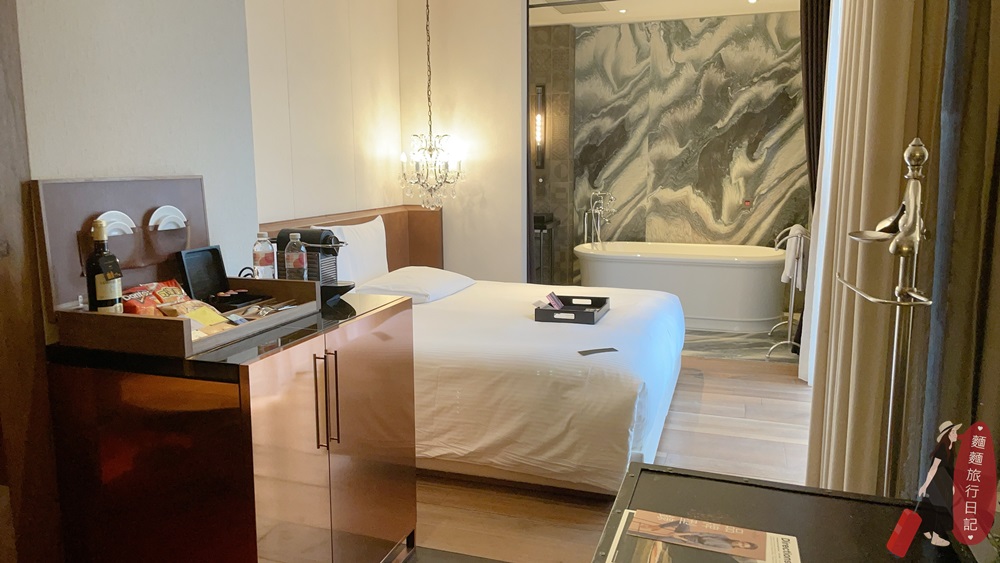 臥床區的顏色就比較淺色系,很舒服~床前面就是落地窗採光很棒,床邊有一個水晶吊燈,有一種歐洲宮廷復古風,床睡起來還OK滿舒服的~
