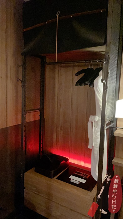 接著是工業風的開放式衣櫃、行李架,衣櫃後方居然是紅色燈光,是不是有點迷幻呀!