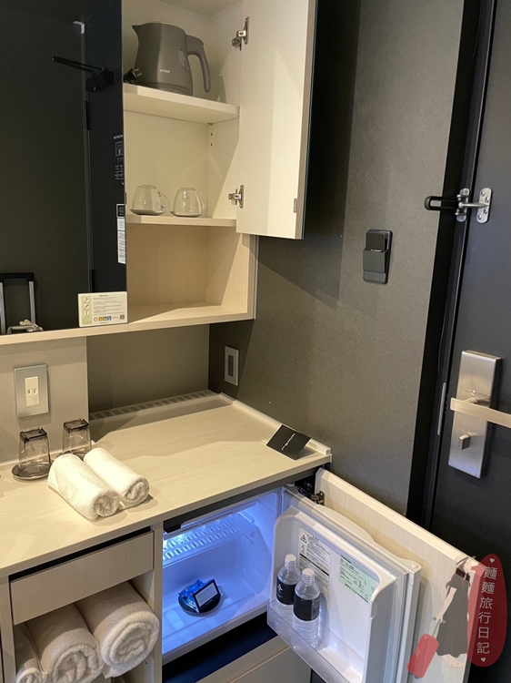 不浪費每個空間,洗手台旁邊的邊櫃放杯子跟煮水壺、下方居然放一台小冰箱!