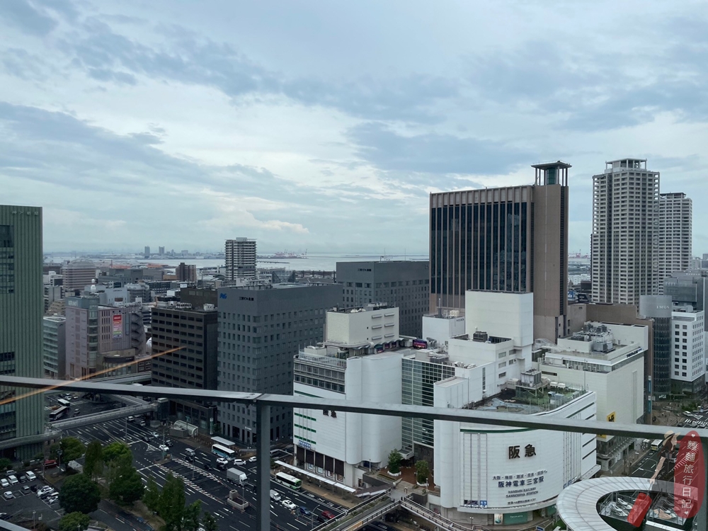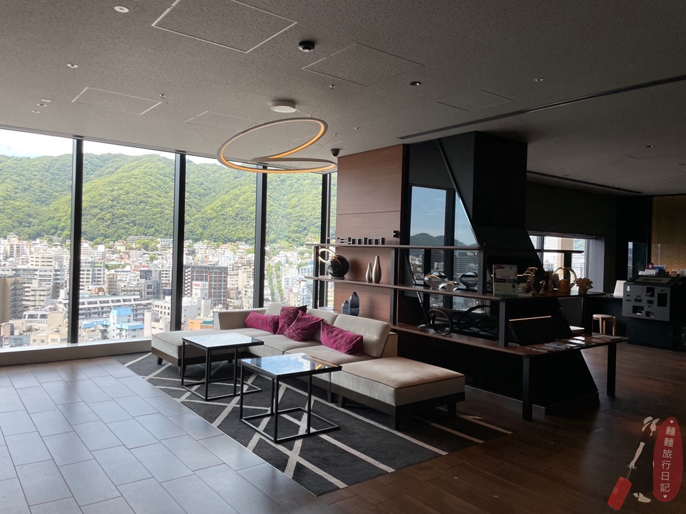 大廳休息區,旁邊一整片落地窗可以將三宮市景盡收眼簾。