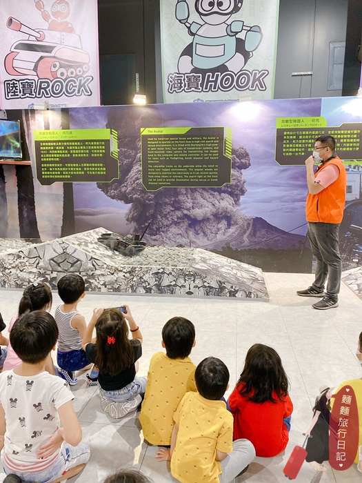 沒想到小朋友們聽的超級入迷,爸媽們站在後面整個好輕鬆啊(哈哈哈),導覽員正在開機器人戰車~