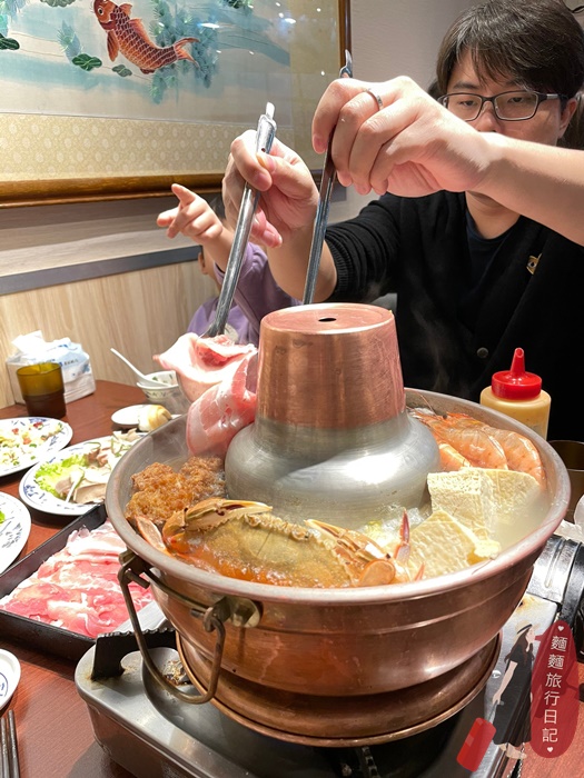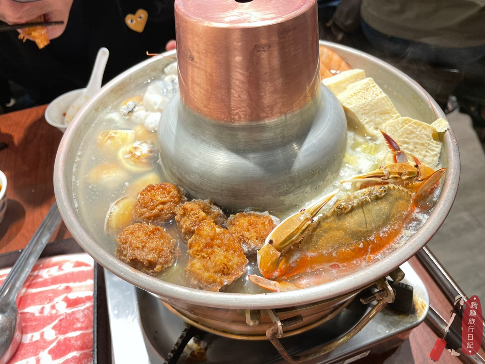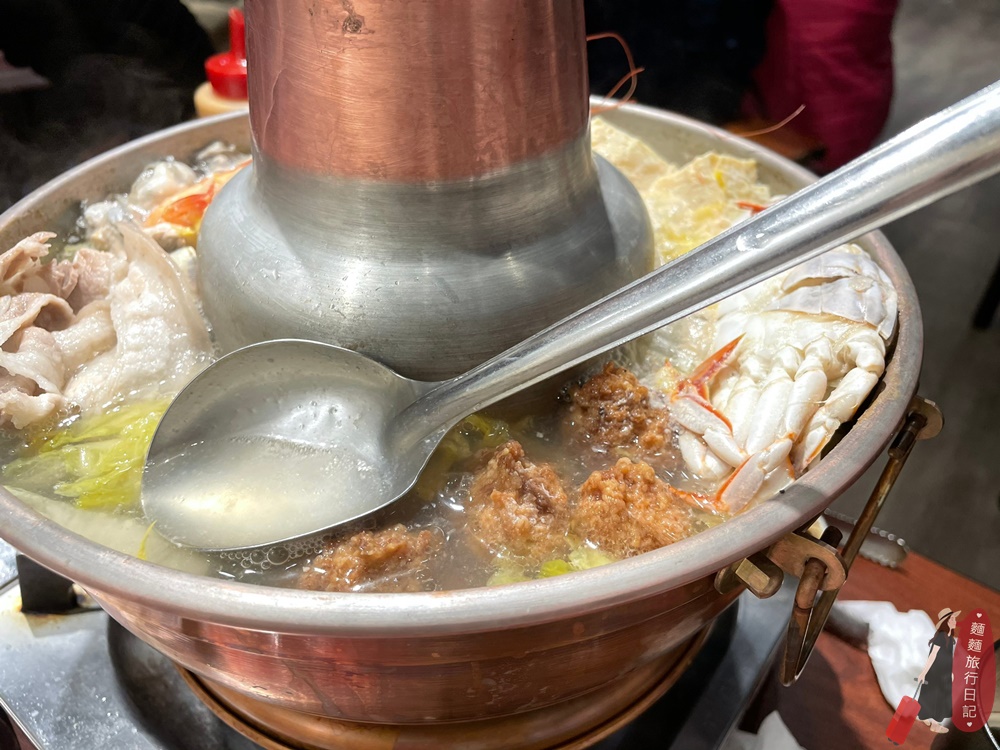 蝦子、蛤蠣、炸肉丸子、凍豆腐、螃蟹、鮮蚵、白菜!!!滿滿一鍋熱呼呼~酸爽夠味,超級好吃,真的不輸台北有名的「台電」和「長白」的酸菜白肉鍋。