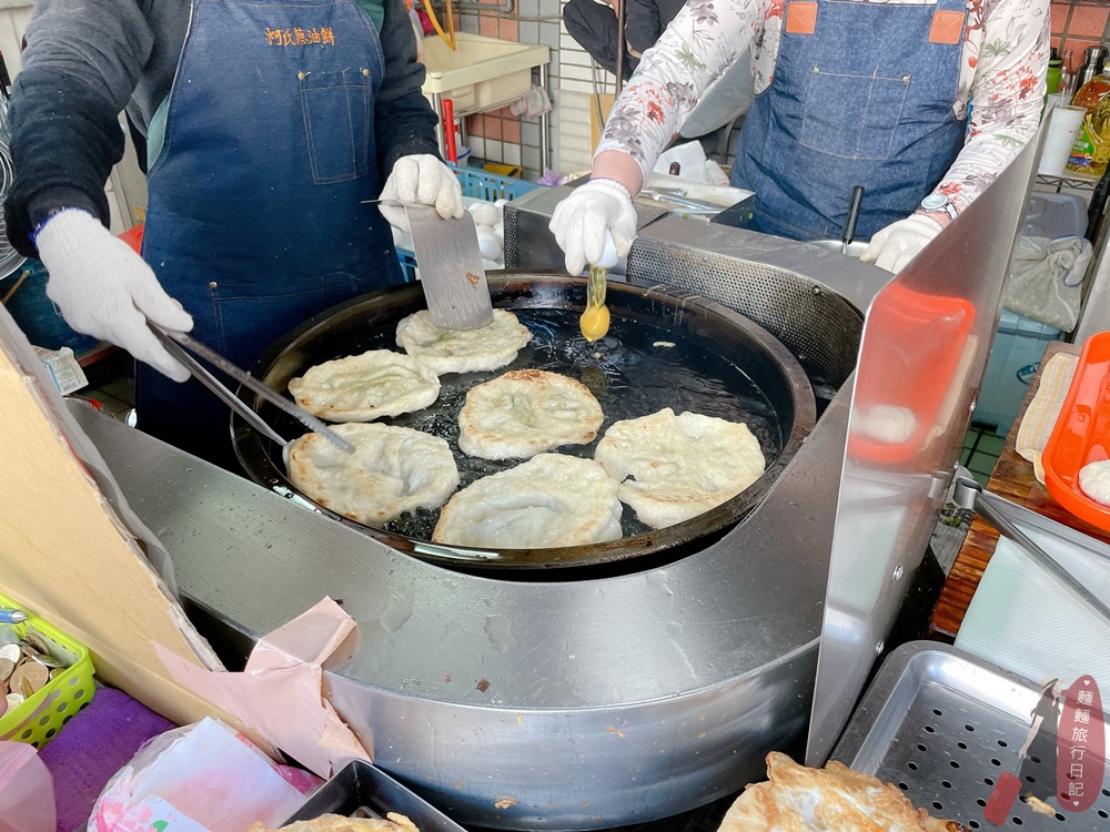 柯氏蔥油餅的蔥餅是先把壓扁的麵團丟進油鍋裡炸到蓬鬆,在加入蔥、雞蛋,炸到兩面金黃酥脆就可以出鍋!