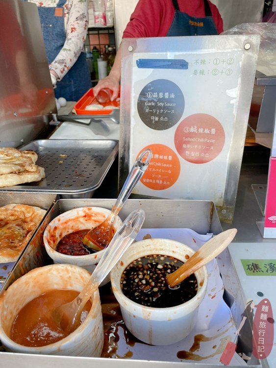 醬料客人可以自己刷,柯氏蔥油餅有三種醬料,分別是蒜蓉醬油、招牌甜辣醬(不會辣)、鹹辣椒醬(偏鹹)!