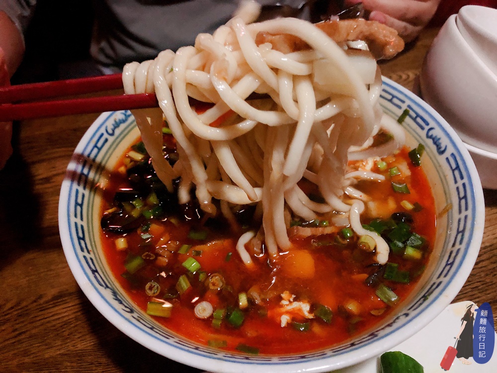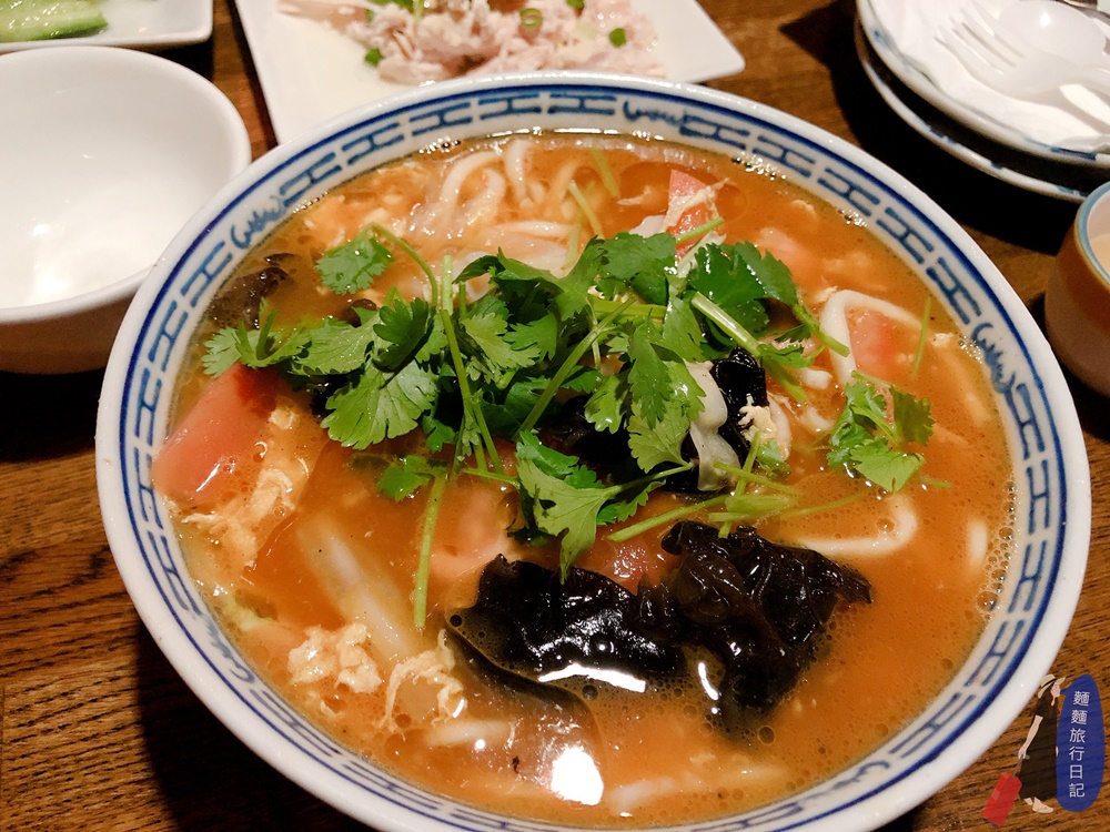 這碗麵跟我心目中想的哨子麵可是完完全全母港款啊~不是我們在台灣常吃的那種味道!台灣的哨子麵通常是肉末,這碗用的是五花肉切片、切絲、然後有土豆、豆腐、木耳、雞蛋、韭菜,有看到湯上面浮著一層油齁~就是油、香、辣、麻、酸,非常重口味的一碗湯麵!