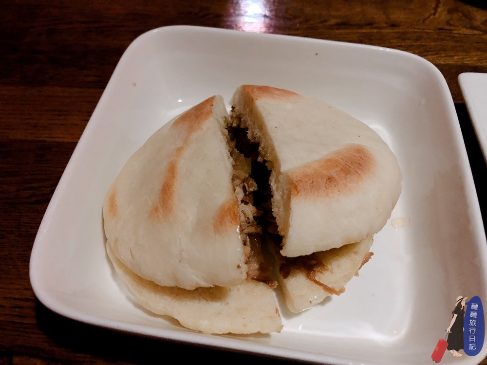 嘗試性的點了一個肉夾饃給波仔跟樂樂吃!一份就是長這樣,很像饅頭切一半夾臘肉。