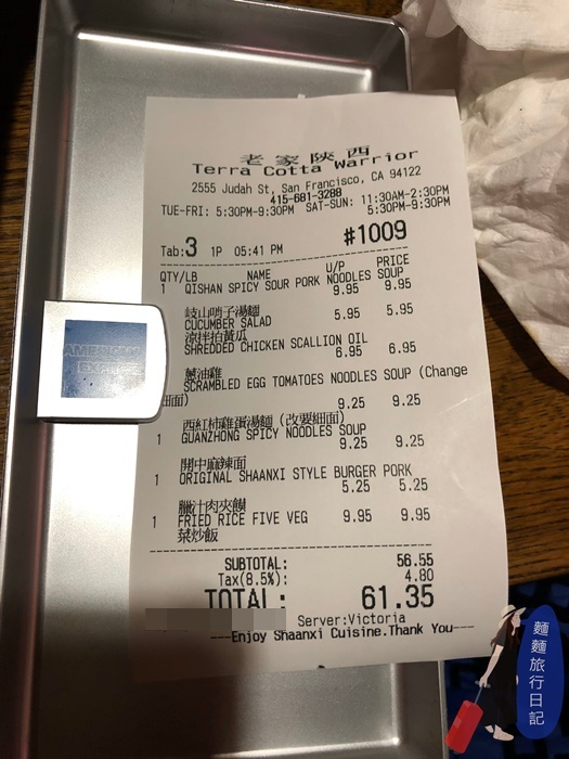 美國舊金山的老家陝西風味麵食 Terra Cotta Warrior,不知道是不是我們吃不習慣陝西料理還是點錯菜,辣是辣得過癮、很香很麻,但是味道偏重、而且很油啊!我們還是比較喜歡台灣菜的亞洲味,但是網路好評不斷,很多人推薦外,名人也愛吃這間餐廳,因為口味上每個人還是各有所好,如果你愛吃涼皮、泡饃、肉夾饃等料理,那可以來試試看喔!就在舊金山必逛景點金門公園附近,逛完剛好可以來吃個晚餐!
