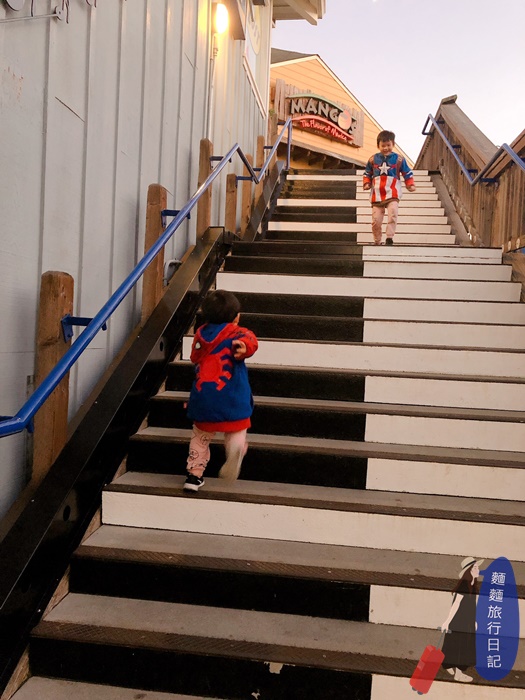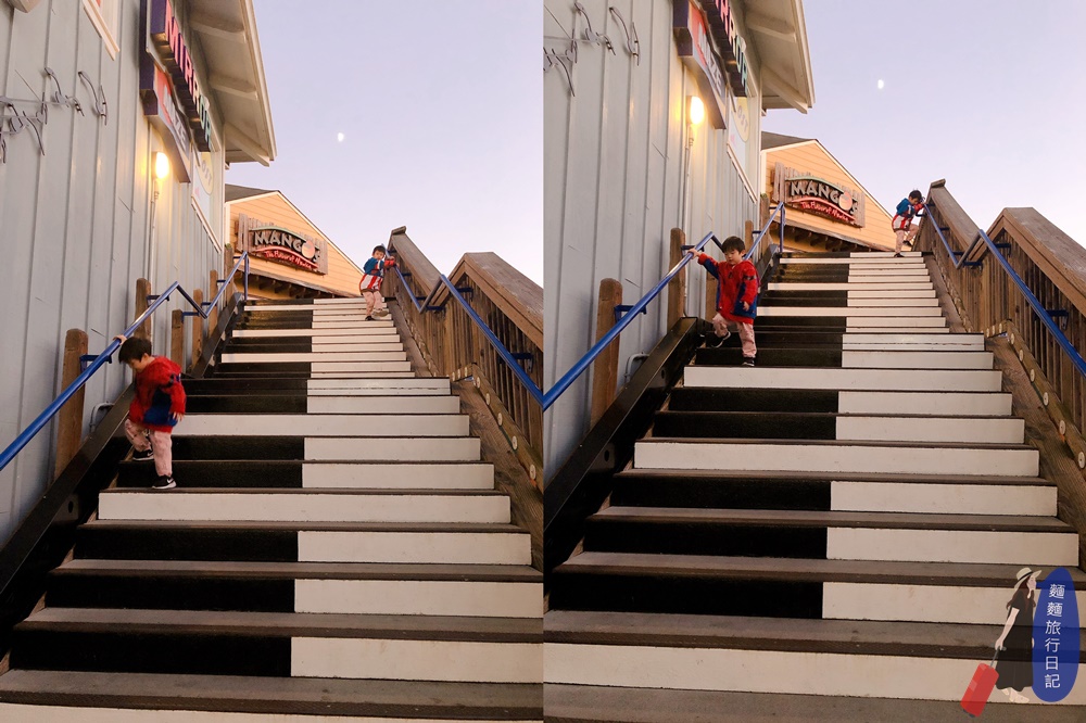 39號碼頭前往二頭的樓梯彩繪成鋼琴黑白鍵的音樂階梯,光是這樣波仔跟樂樂就可以在樓梯玩很久,因為會發出鋼琴的聲音!這是我們已經吃完螃蟹後拍的照片,這時候太陽快下山了!