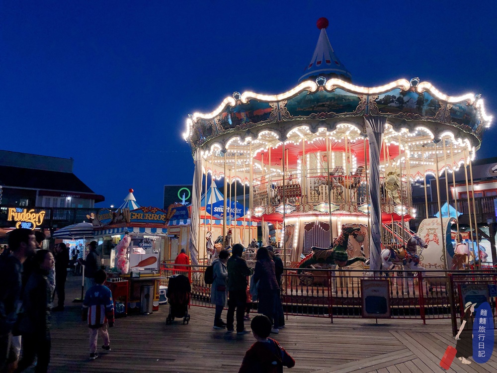 晚上的39號碼頭還有會發光的旋轉木馬,還是雙層的旋轉木馬欸!波仔跟樂樂對旋轉木馬沒啥興趣,但是我覺得很美很好拍啊!其實39號碼頭棧板中心位置有一個表演舞台,假日的時候會有表演節目,平日來雖然看不到表演,但是有很多街頭藝人會在棧板上表演,氣氛還是非常歡樂啊!我們一家從白天玩到晚上,超級喜歡漁人碼頭的。