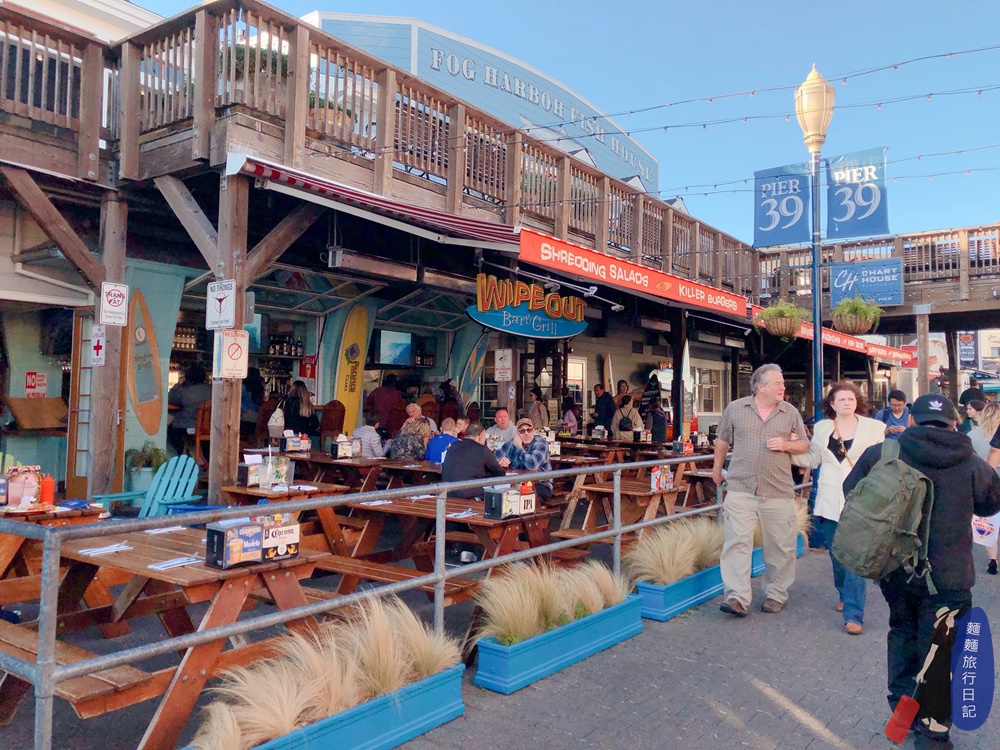 漁人碼頭除了港口海景外,還有很多海鮮餐廳、商店之外,幸運的話還可以看到海獅躺在39碼頭的木棧板上曬太陽的場景喔~我們從惡魔島回來後,飢腸轆轆於是慢慢移動到39號碼頭,尋找看看有什麼食物~~~