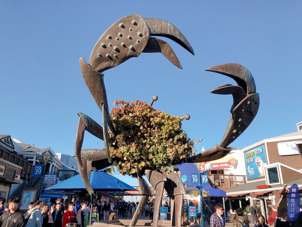 看到這個超大隻的大螃蟹銅像就代表你已經走到最熱鬧的39號碼頭啦~這裡有一整條街全都是賣螃蟹的餐廳,為甚麼螃蟹如此有名呢,這隻螃蟹其實是加州獨有的首長黃道蟹Dungeness crab ,是美西到阿拉斯加的特有品種,每隻蟹都比臉還大,最大的特色就是蟹腳粗又肥,肉質飽滿又鮮甜,蟹肉超多,殼很薄~~~愛吃螃蟹的話建議找間海鮮餐廳吃吃看,村長每次都覺得吃螃蟹很搞剛麻煩,殼硬得要命,但是吃首長黃道蟹超級輕鬆完全不費力欸!我沒有用任何工具,就嗑光光蟹肉啦!