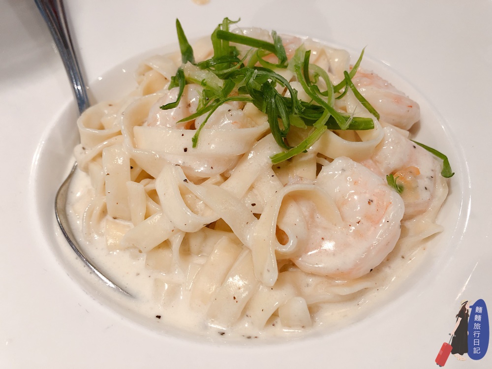 因為怕吃不飽,所以還有點義大利麵,不要看這小小的一份,份量十足啊!這是蝦仁寬麵,蝦子非常大隻,很好吃!麵條也非常有嚼勁,好吃好吃,好吃的餐點通常一下子都會被波仔跟樂樂吃光光!