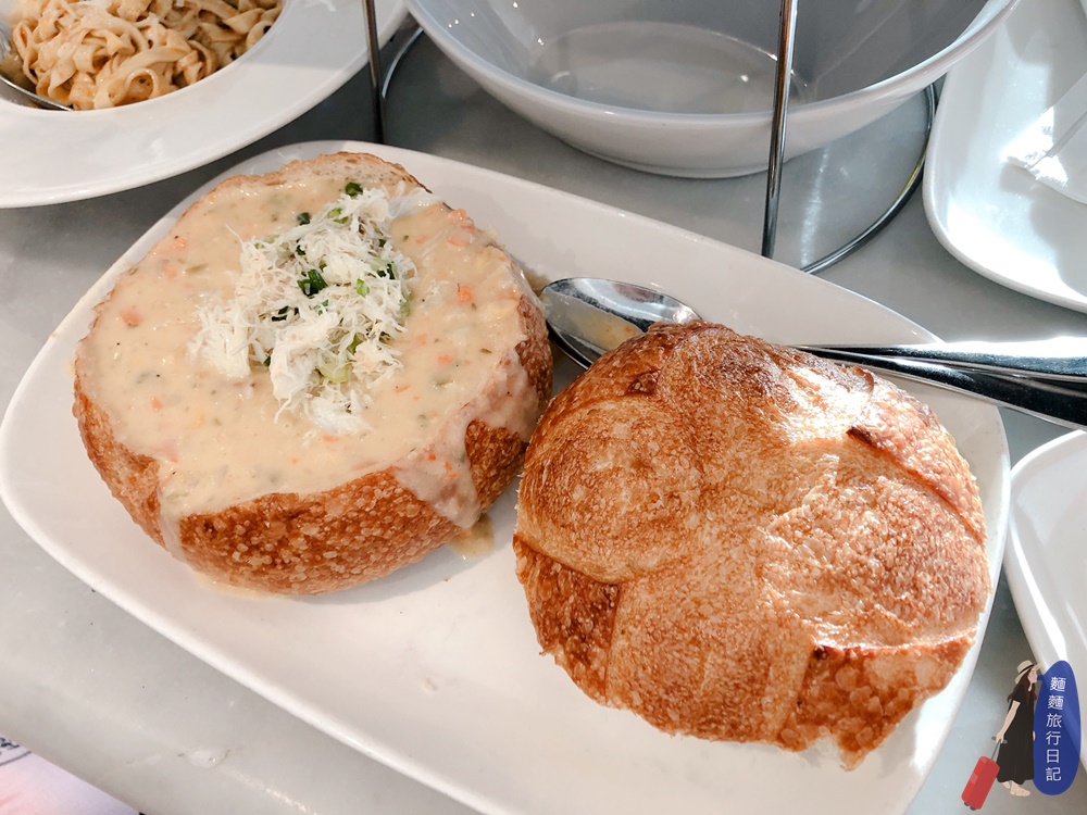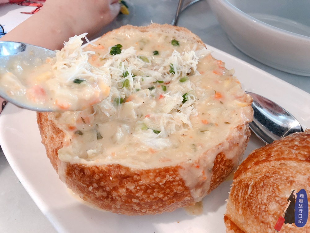 點了一碗來漁人碼頭必喝的蛤蠣巧達濃湯,濃湯用一個酸麵包掏空裝著,麵包是那種很紮實很有嚼勁的口感。