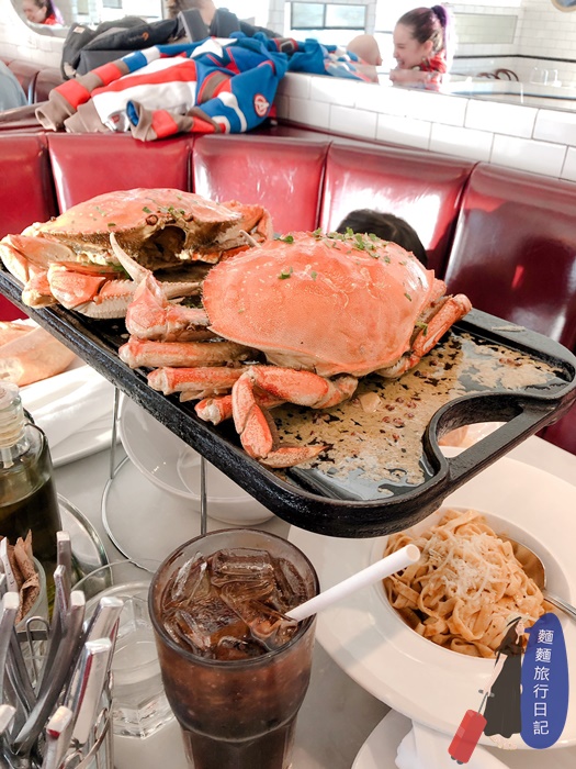 舊金山漁人碼頭必吃美食Crab House at Pier 39,都來到漁人碼頭了哪有不吃海鮮的道理,漁人碼頭附近有很多好吃的海鮮餐廳,今天我們要吃的螃蟹屋,就是以海鮮為主的料理,熱門必點當然就是美國才有的Dungeness 首長黃道蟹,除了各式各樣的海鮮料理之外,這裡也有來漁人碼頭必吃的蛤蠣巧達濃湯、跟一些義大利麵可以點,菜單種類很豐富唷,螃蟹真的超級巨大,送上來的時候大家都看傻,比我的臉還大啊!