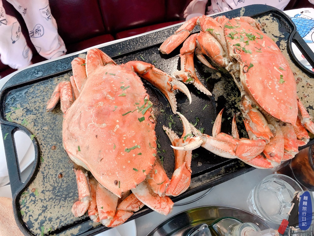 螃蟹品種是加州獨有的首長黃道蟹Dungeness crab ,是美西到阿拉斯加的特有品種,每隻蟹都比臉還大,蟹腳粗又肥,肉質飽滿又鮮甜,蟹肉超多,殼很薄,吃這隻大螃蟹完全不需要用到工具,就可以輕而易舉的吃蟹螯裡的肉。