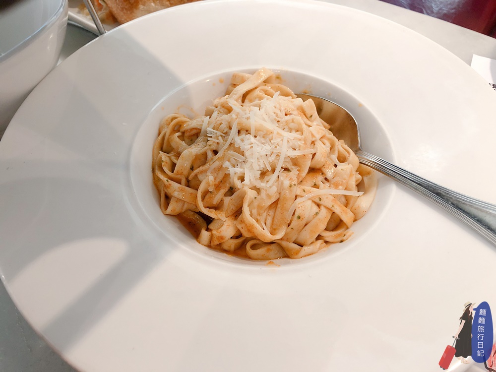 除了白醬的蝦義大利麵,還點了一份紅醬的蟹肉寬義大利麵,一樣也是很好吃,茄汁跟蟹肉很搭欸!