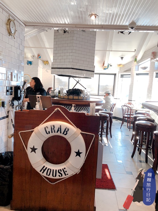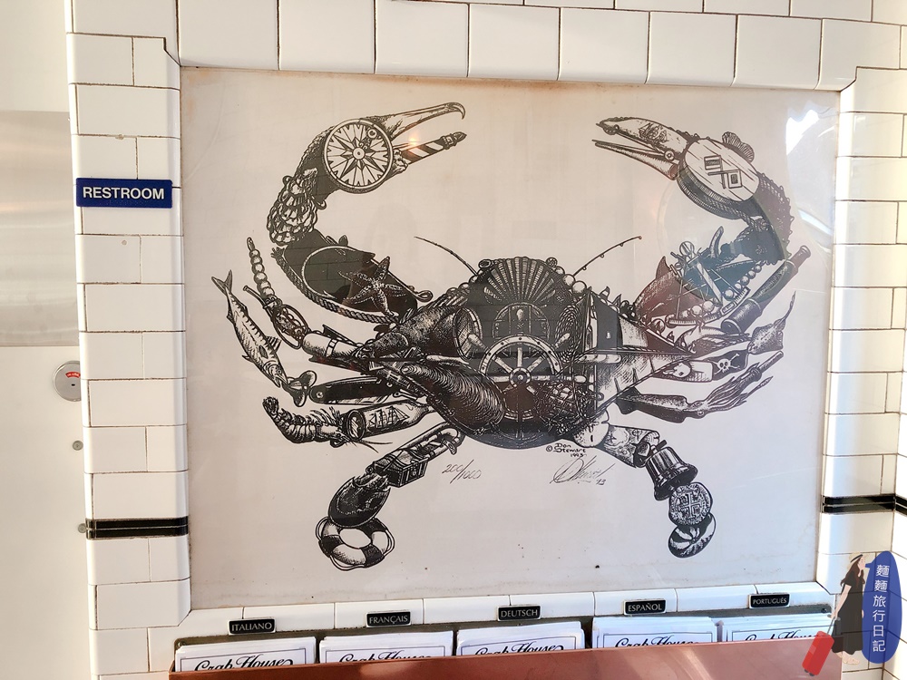 我們下午的行程是搭船去惡魔島參觀,去惡魔島的船都是在漁人碼頭,所以參觀完惡魔島回到漁人碼頭後,波仔跟樂樂也差不多餓了,晚餐就決定在附近找間海鮮餐廳吃晚餐!今天我們要吃的這間Crab House at Pier 39餐廳,在39號碼頭2樓,餐廳外觀是白底加上大大的Crab House螃蟹屋的LOGO,找這間餐廳主要目地當然是來吃螃蟹啊!一進到餐廳裡面就看到牆上一隻大螃蟹在迎接我們了。