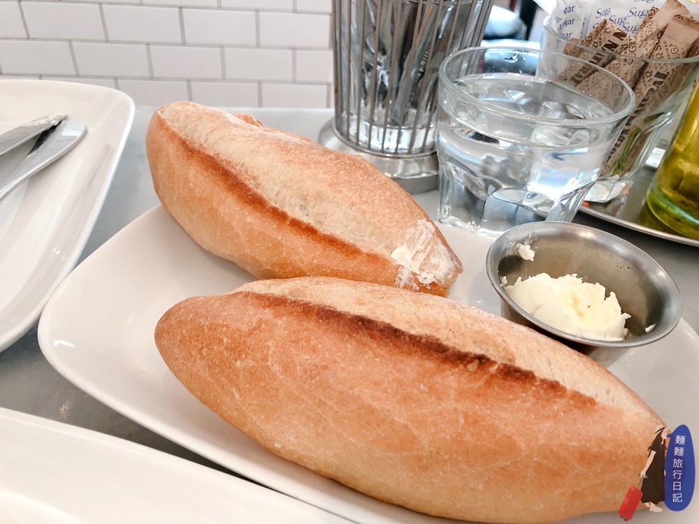 餐廳會先送上餐前麵包,這兩根法國麵包跟你想的一模一樣,硬梆梆的唷~旁邊有奶油可以塗著吃!桌上也有放橄欖油及紅酒醋,可以沾著吃,或是搭配等一下會送上來的螃蟹醬汁(是蒜香奶油醬),也超級好吃~
