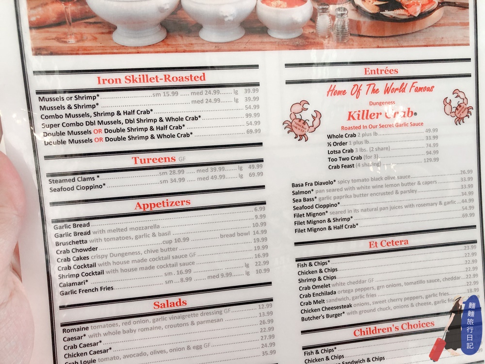 門口菜單可以自己拿,也有英文菜單~~~左邊有一些海鮮鐵板燒、清蒸海鮮、前菜、沙拉等可以選擇、右邊是螃蟹屋必點的Killer Crab料理喔~~~用餐廳獨家的蒜頭奶油醬煮海鮮!