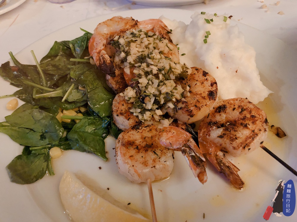 還有一道烤蝦子,上面一樣淋大蒜奶油,巨無敵香,旁邊配菜有炒菠菜、南瓜、馬鈴薯泥。