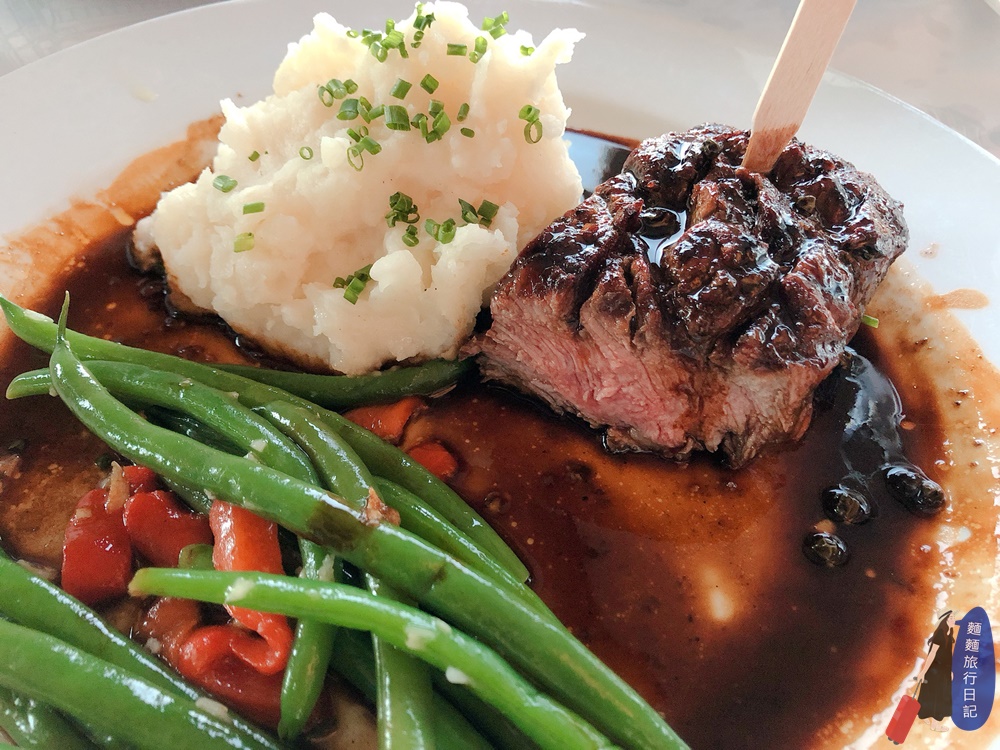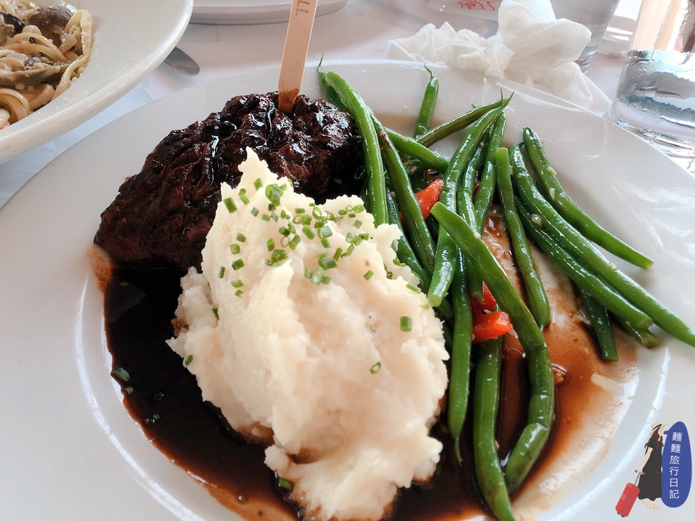 除了螃蟹我還點了一份牛排,其實我們在美國吃了很多次牛排,但是因為要給小孩吃之前都點全熟,牛排都太老很硬不好吃,害我們還想說是誰說美國牛排最好吃的,難吃死了都咬不動,結果根本是我們點錯了,今天點的是7分熟,結果牛肉爆嫩爆炸好吃啊!嗚嗚~終於在最後一天吃到好吃的牛肉了!