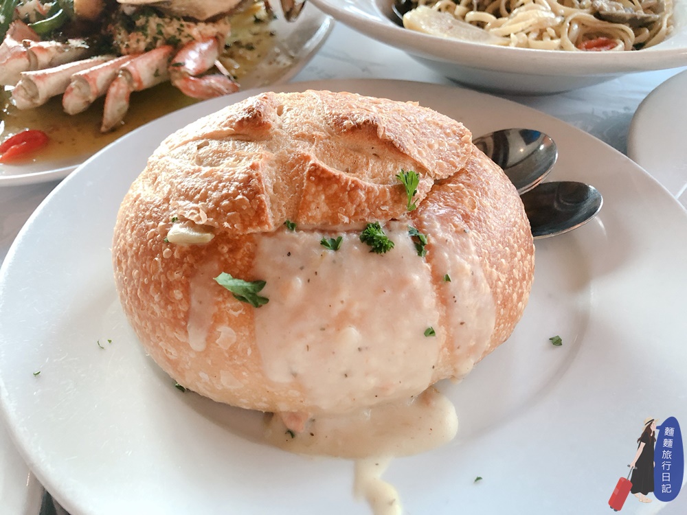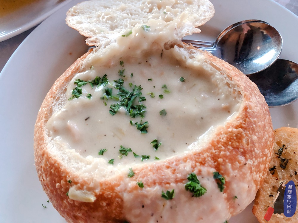 覺得都來到漁人碼頭了不免俗的還是要點一碗必喝的蛤蠣巧達濃湯,剛好波仔跟樂樂很愛喝濃湯,濃湯用一個酸麵包掏空裝著,麵包是那種很紮實很有嚼勁的口感,這間餐廳的巧達濃湯還可以加7塊鎂增加蟹肉!