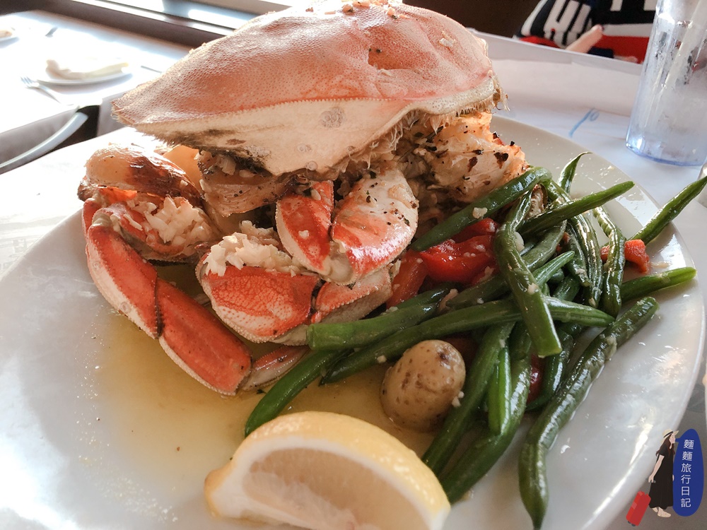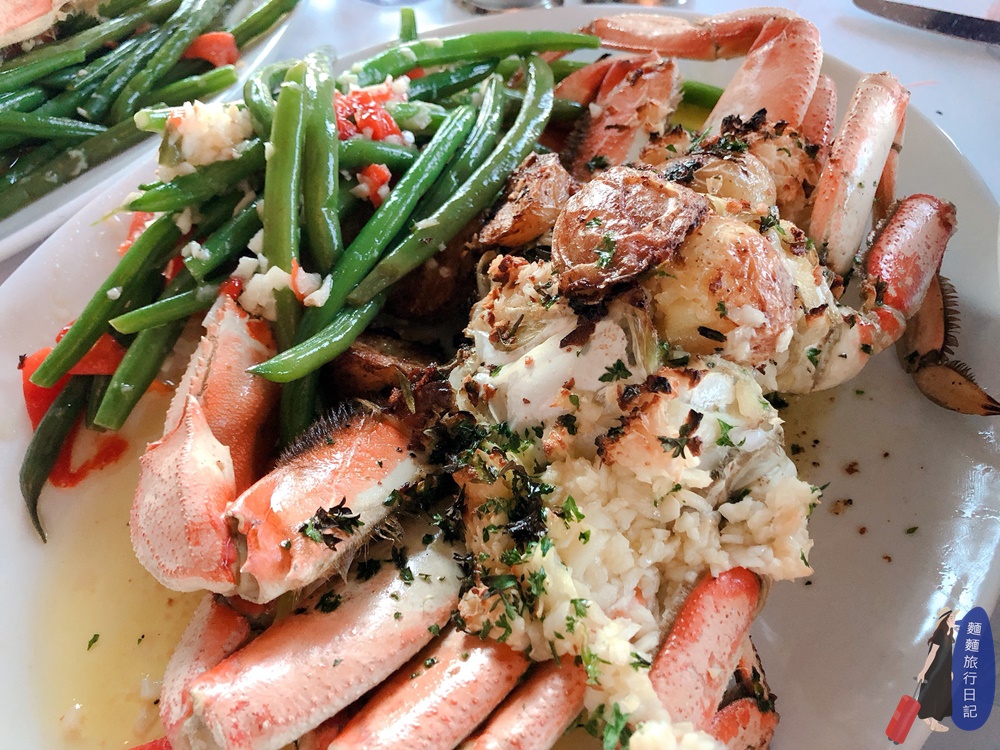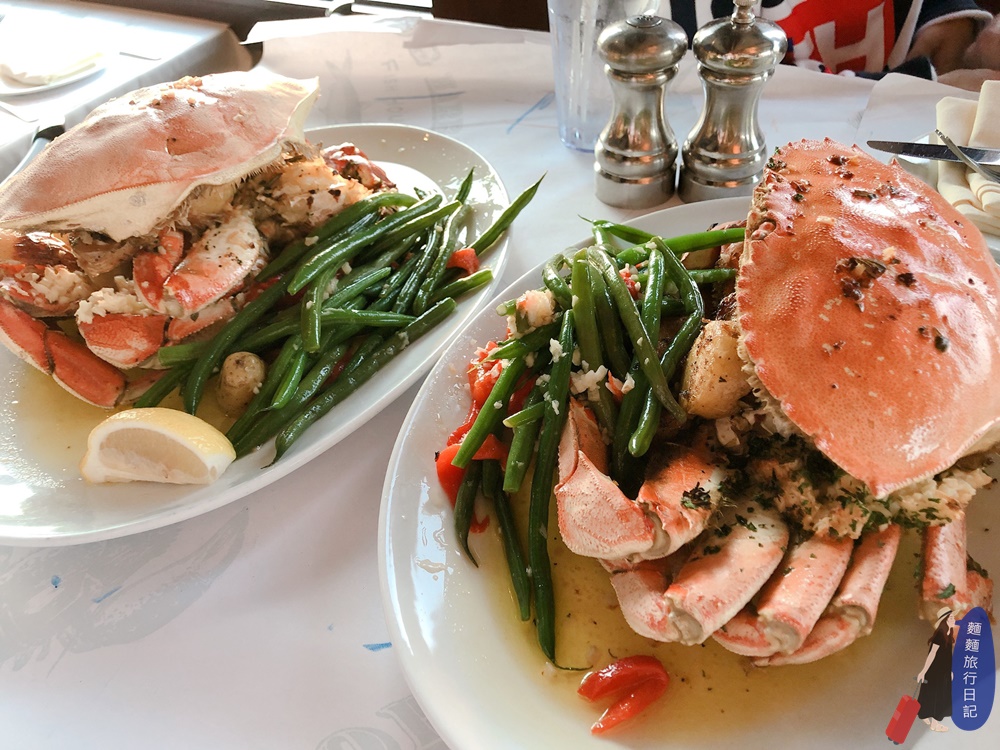 點了兩支蒜香奶油螃蟹,來舊金山漁人碼頭一定要找一間海鮮餐廳吃螃蟹,碼頭還有一整條街都是賣螃蟹的,這裡的螃蟹有什麼特別的嗎?漁人碼頭的螃蟹是加州獨有的首長黃道蟹Dungeness crab ,首長黃道蟹是美西的阿拉斯加的特有品種,每隻螃蟹都比臉還大,蟹腳粗又肥,肉質飽滿又鮮甜,蟹肉超多,殼很薄,吃這隻大螃蟹完全不需要用到工具,就可以輕而易舉的吃蟹螯裡的肉。