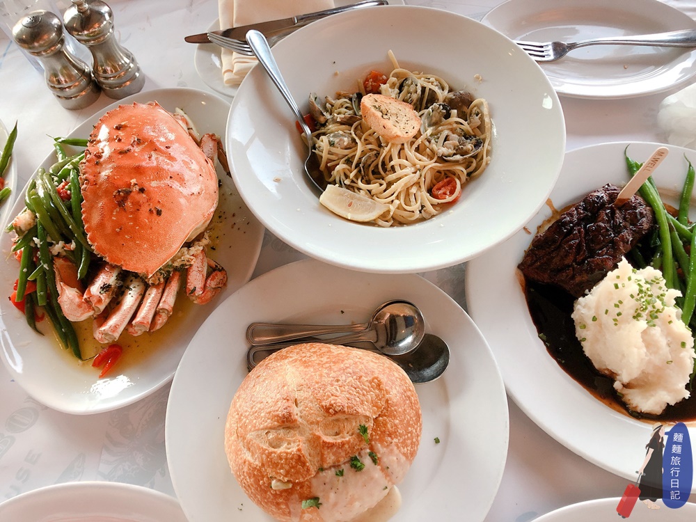 餐點來囉~不小心就滿滿一桌,螃蟹跟義大利麵都點了2份呢~除了螃蟹跟義大利麵,還點的牛排、漁人碼頭必喝的蛤蠣巧達濃湯、烤蝦、兩個甜點!