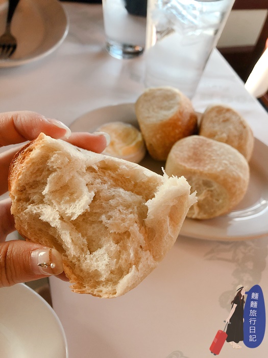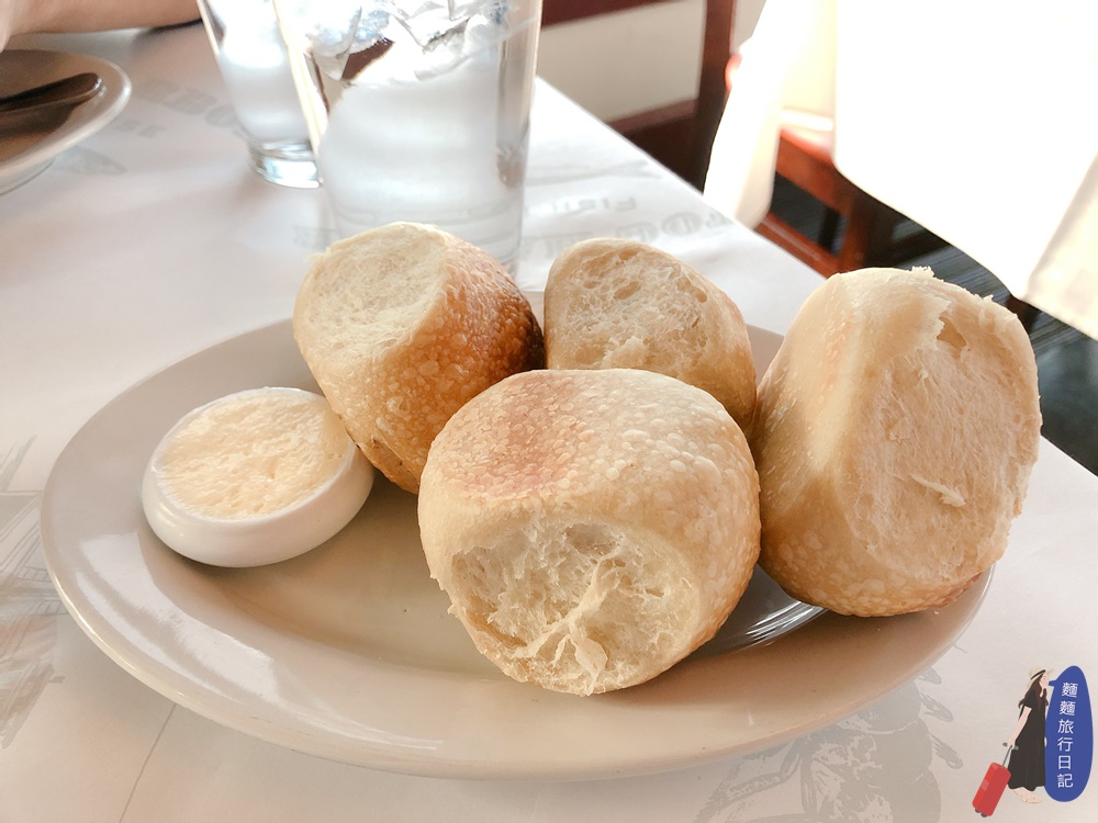這是免費贈送的餐前麵包,就是舊金山著名的酸奶麵包,外表烤得很酥脆,裡面很鬆軟,可以搭配奶油一起吃~