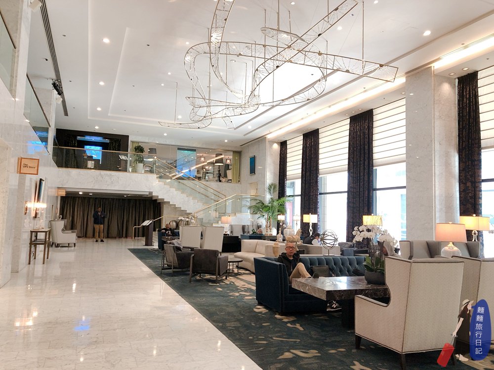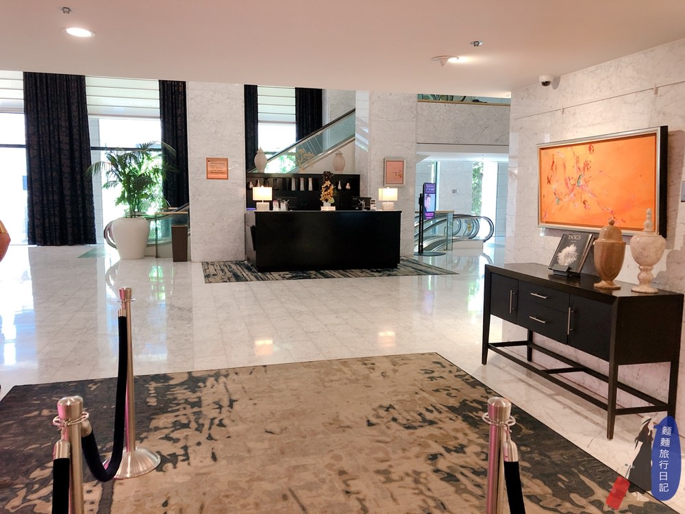 酒店裡面非常寬敞,米白大理石、金色搭配為基底色,讓大廳空間很明亮、氣派、時尚,利用深色的地毯、沙發、窗簾,讓整體空間更有層次。