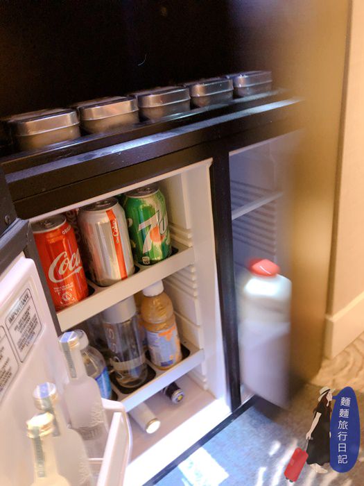 酒店的冰箱是免費使用,但是裡面滿滿的酒啊、飲料啊!都是要付費的喔!