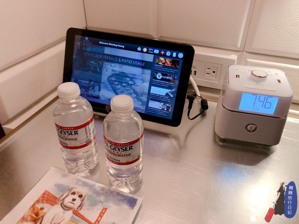 床頭邊的小櫃子上有附一個PAD跟小時鐘~ 下面那張小卡超級可愛,是本酒店是吉祥物店狗的明信片,狗狗後面是舊金山的著名景點金門大橋。