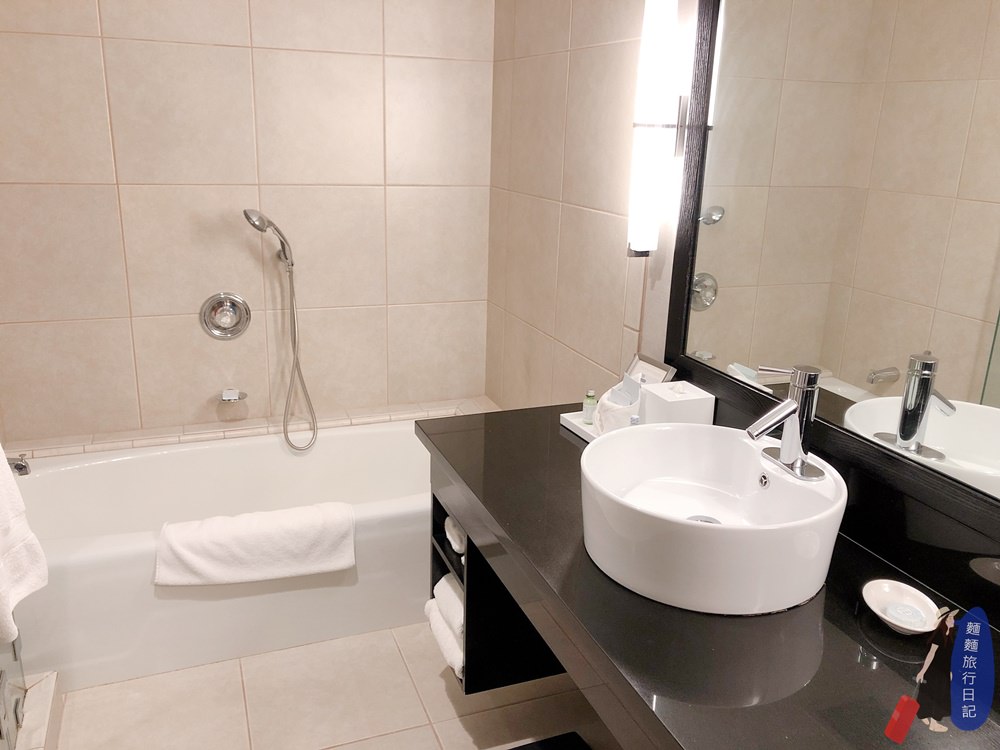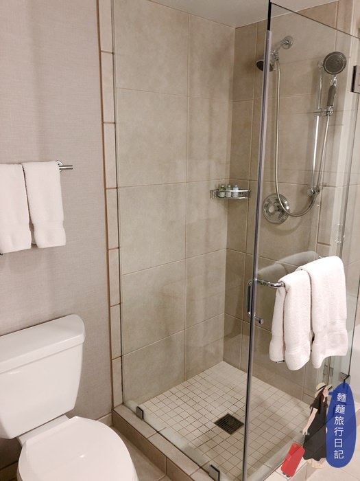 浴室也很舒適,這間酒店都走白色簡約系,淋浴間在馬桶旁邊,淋浴間是有點小巧一點,完全正方形,兩個人在裡面可能會有些壅擠。