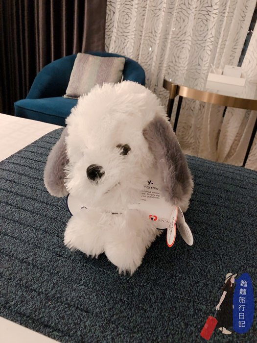 床上還有一隻可愛的酒店鎮店之吉祥物,可愛的狗狗一枚,記得我們在手扶梯旁的牆上也有這隻可愛的狗狗嗎? 床上也有一擺一隻可愛的狗狗喔!