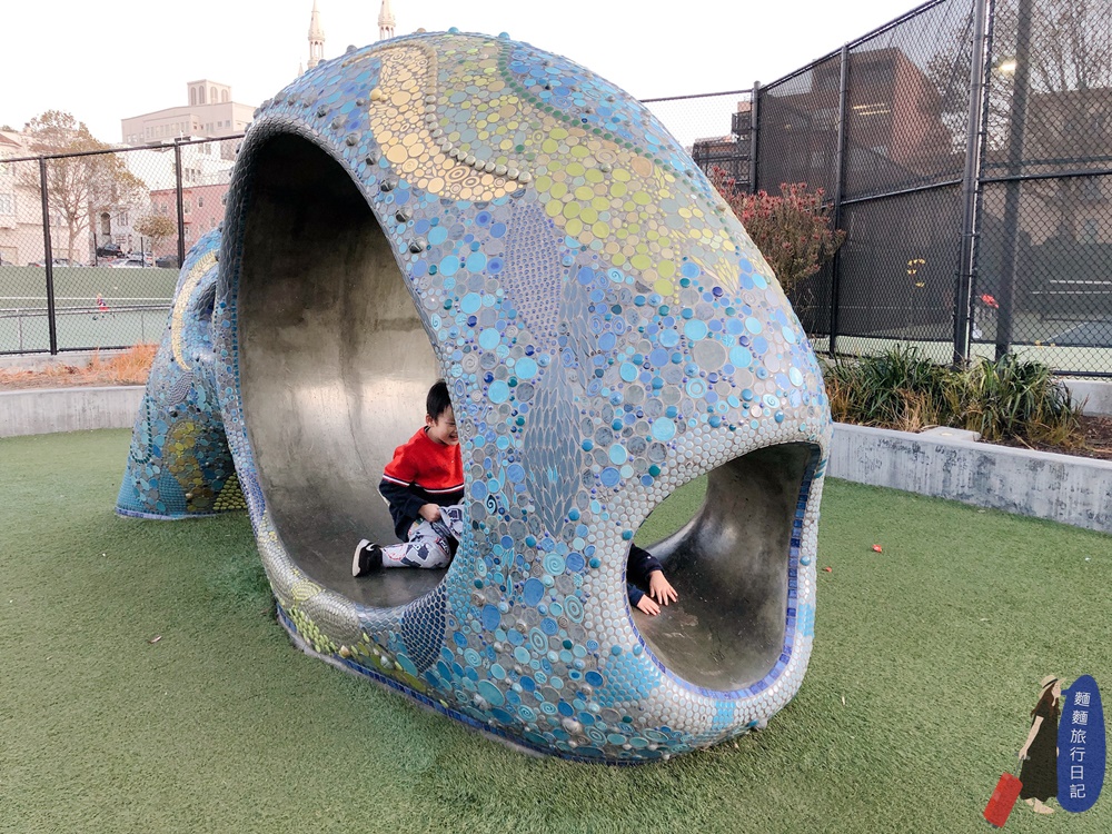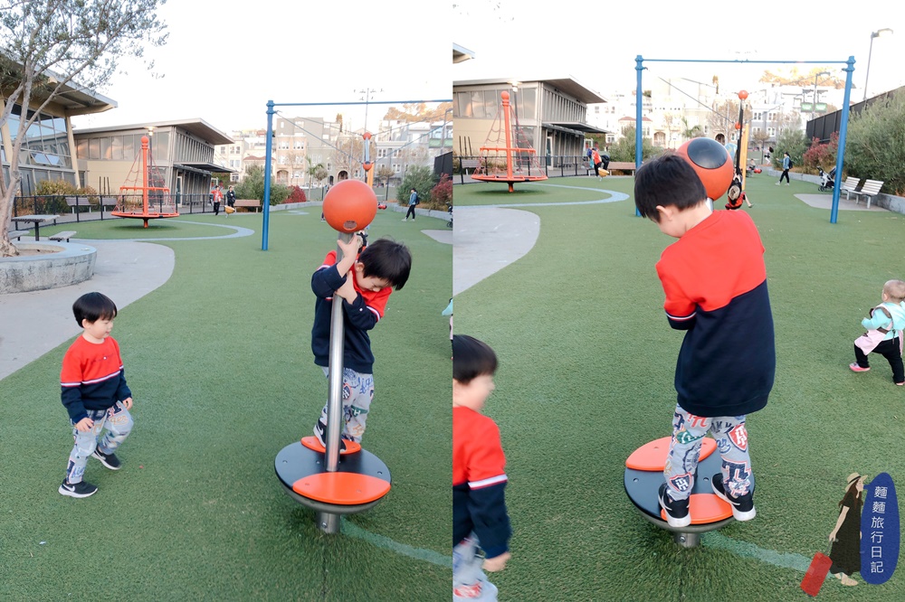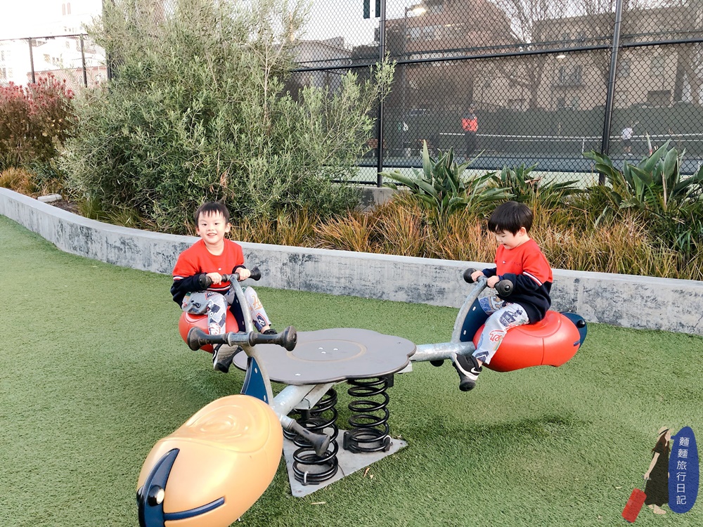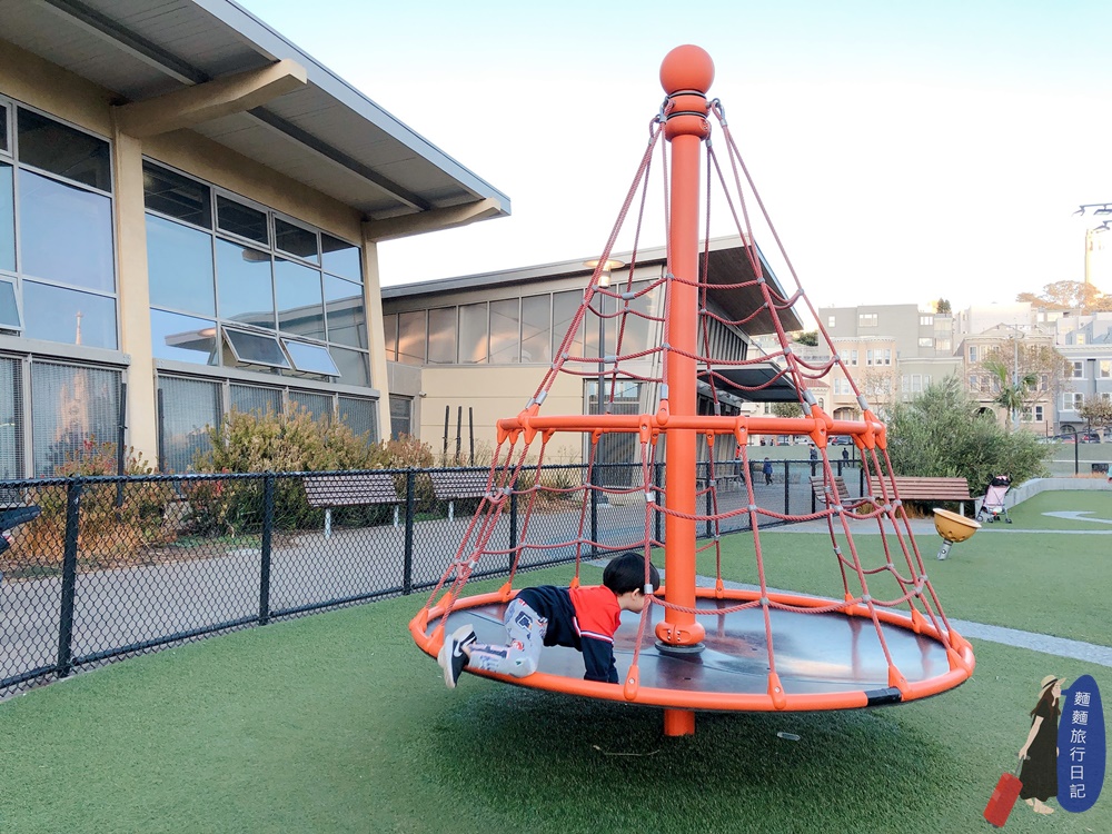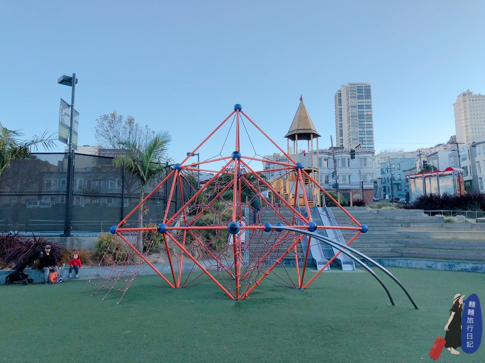 舊金山親子必去遛小孩公園Joe DiMaggio Playground,這是在舊金山小義大利區裡的公園,有兒童遊樂區,網球場,地擲球場,游泳池建築物和運動場,兒童遊樂場雖然不大,但是遊樂設施都非常好玩,波仔跟樂樂玩的超開心、旁邊還有一個籃球場,最後就連大猴也跑去隔壁打籃球,超級推薦親子行來遛小孩!小義大利區有很多小酒館、餐館,每間看起來很好吃,遛玩小孩後可以找間餐廳吃晚餐喔!