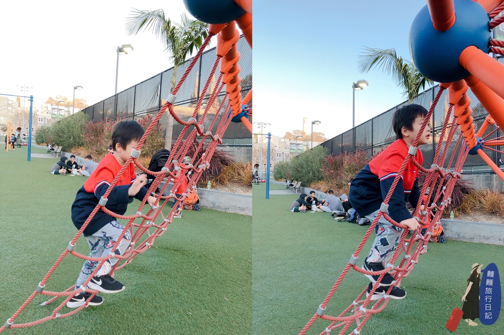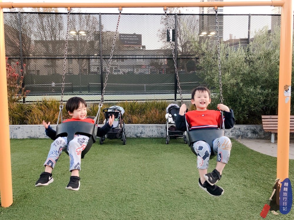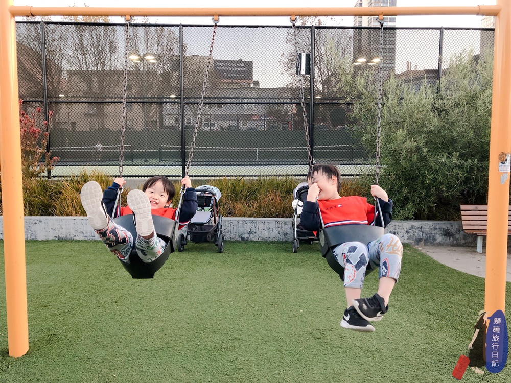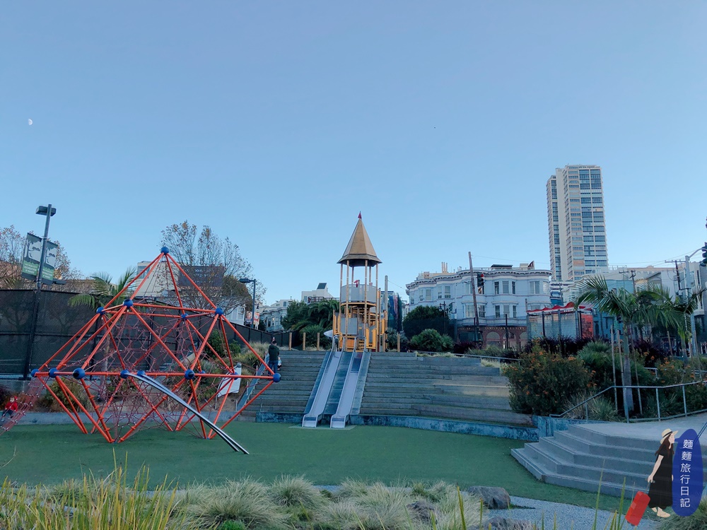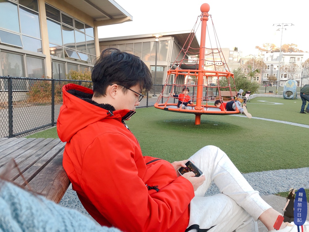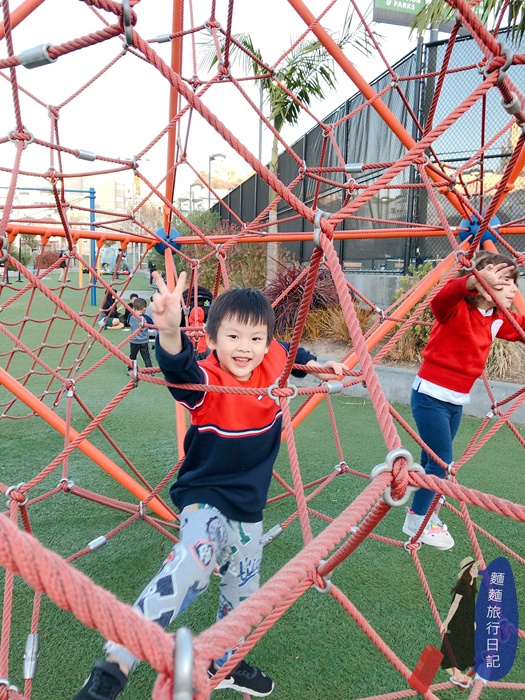 舊金山親子必去遛小孩公園Joe DiMaggio Playground,這是在舊金山小義大利區裡的公園,有兒童遊樂區,網球場,地擲球場,游泳池建築物和運動場,兒童遊樂場雖然不大,但是遊樂設施都非常好玩,波仔跟樂樂玩的超開心、旁邊還有一個籃球場,最後就連大猴也跑去隔壁打籃球,超級推薦親子行來遛小孩!小義大利區有很多小酒館、餐館,每間看起來很好吃,遛玩小孩後可以找間餐廳吃晚餐喔!