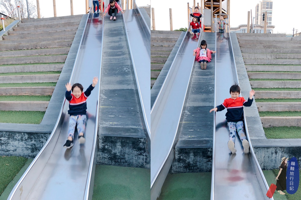 波仔跟樂樂每次去遊樂場都會先玩溜滑梯,這個滑梯滿長不陡很安全!中間那個不是可以遛的喔~波仔原本要跟著前面的小孩遛中間那條,被我阻止了!