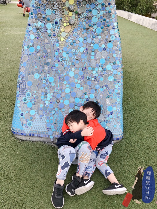 地上部分是人造草地、有些是真的草皮,就算是真的草皮也有修剪喔,小孩在草地上奔跑玩樂都有緩衝,爸媽可以很放心!我們來的時候也有很多附近居民帶著小孩來公園玩耍!