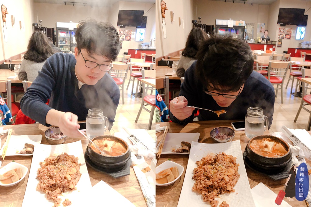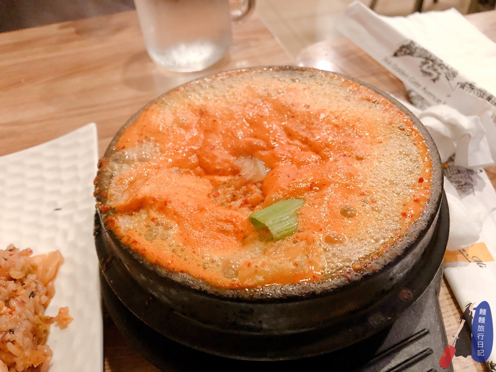 送上來用的泡菜湯啵啵啵啵啵的沸騰得不停,看起來就很好吃啊~這鍋湯裡放了豆腐、泡菜跟豬肉,這三樣食材真的是絕配,湯真的好好喝啊!看看大猴一口泡菜湯一口紫米飯,一下子就秒吃完一碗飯了,是不是飯桶啊(哈哈哈偷罵)