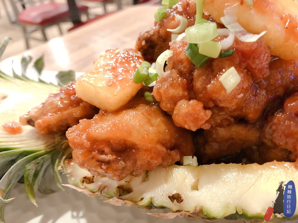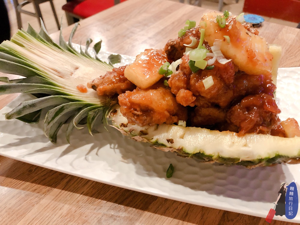 這間韓式非常難得有韓國炸雞可以點,當然要點一份來吃吃看啊!炸雞的部分都是使用炸雞,醬料可選糖醋、醬油、糖醋、醬油、韓式辣醬(就是甜辣醬啦)、跟香辣醬,為了讓波仔跟樂樂都可以一起享用美味雞翅,我們點了最經典的韓式甜辣醬口味,很酷的是送上來很像鳳梨蝦球、鳳梨炒飯之類的料理,居然是裝在鳳梨裡,還加了鳳梨果肉!應該是有改良過的,但還是好好吃啊!