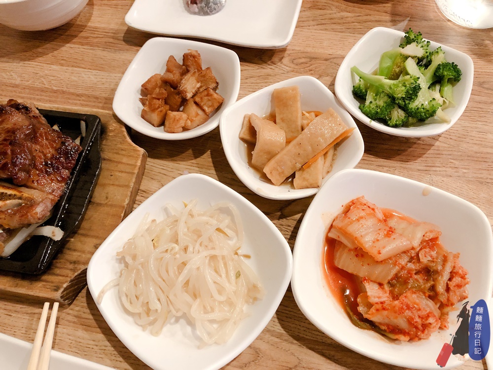 點完餐後,會先上韓式小菜,有豆芽、泡菜、甜不辣(其實是魚板,但吃起來很像甜不辣啊)、豆干跟花椰菜。