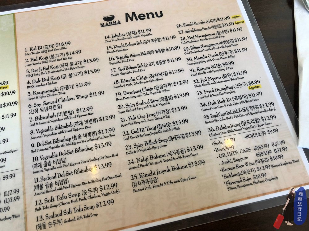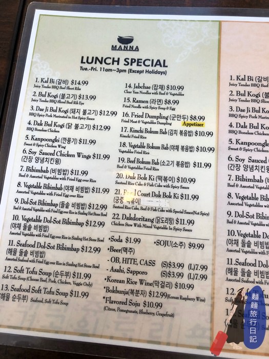 舊金山必吃美食Manna韓式餐館提供傳統道地的韓式料理,價錢非常經濟實惠,味道也很棒喔!老闆應該是韓國人,店裡的員工都是亞洲臉孔貌似韓國人,餐廳明亮乾淨,用餐時非常舒適,餐廳平日周一至周五還有特別的午餐優惠,覺得非常划算呢!是在舊金山想吃韓國料理的好選擇~