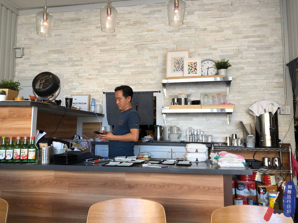 這位應該是老闆吧!應該是韓國人思咪達~餐廳裡面的裝潢滿新的,白色的壁貼加上木質櫃台與餐桌椅,兩面對外的牆壁都用透明玻璃窗取代,陽光直接灑進餐廳裡,舒適又明亮!